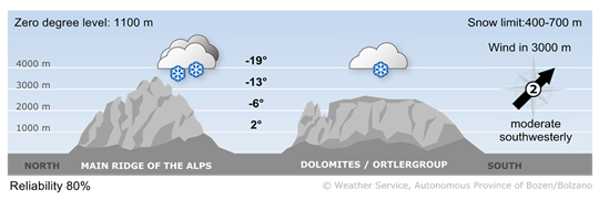 The Alps will be affected by moist southwesterly currents and relatively cold air masses.