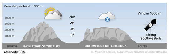 Clouds from South with sunny spells. towards evening and during the night light snowfall will set in in some areas. Temperatures will rise to highs of 0° to 5° in the afternoon.