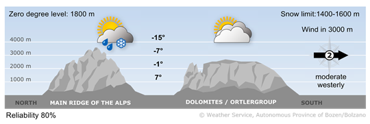 On Tuesday, variable conditions will persist in the north with Föhn winds in the valleys. Towards the south, there will be more sunshine. On Wednesday, sunny and cloudy conditions are expected to alternate. North winds will ease. On Thursday, the weather will be unsettled with precipitation. The snow line will gradually rise to 1000 m. On Friday, the weather will be mainly sunny thanks to the Föhn winds.