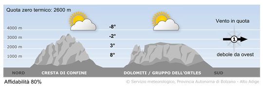 Anche in montagna il tempo sarà soleggiato. Le nubi alte in transito saranno molto sopra le cime. Clima mite.