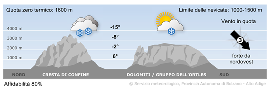 In mattinata si registreranno deboli nevicate lungo la cresta di confine. Verso sud invece il tempo tenderà a migliorare grazie al Föhn. Temperature massime tra 4° e 15°.