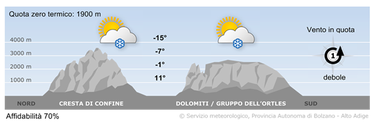 Sui monti altoatesini splenderà il sole per tutta la giornata. In alcune valli potranno formarsi banchi di nebbia.