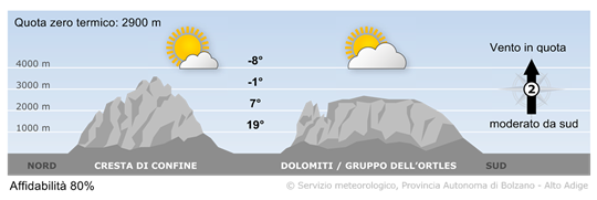 Inizialmente il tempo sarà soleggiato. Nel pomeriggio la nuvolosità tenderà ad aumentare da sud. Temperature massime tra 20° in Alta Val d'Isarco e 24° in Bassa Atesina.